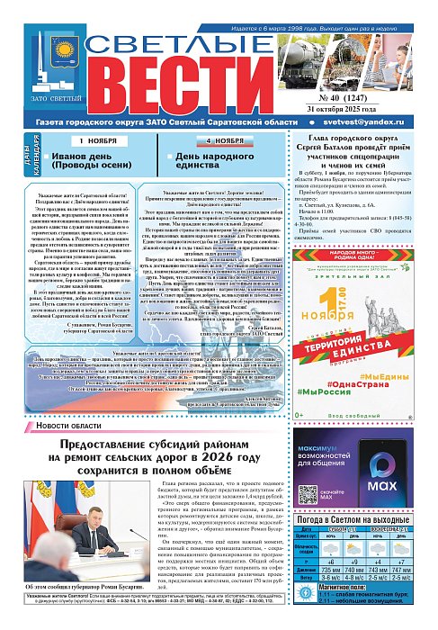 В ближайшем номере газеты «Светлые вести» вас ожидает:- Предоставление субсидий районам на ремонт сельских дорог в 2026 году сохранится в полном объёме;