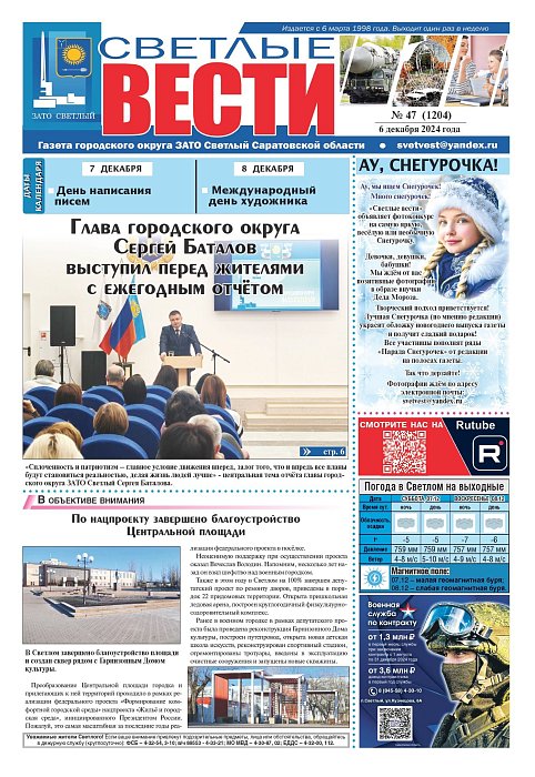 В ближайшем номере газеты «Светлые вести» вас ожидает:- Глава городского округа Сергей Баталов выступил перед жителями с ежегодным отчётом;