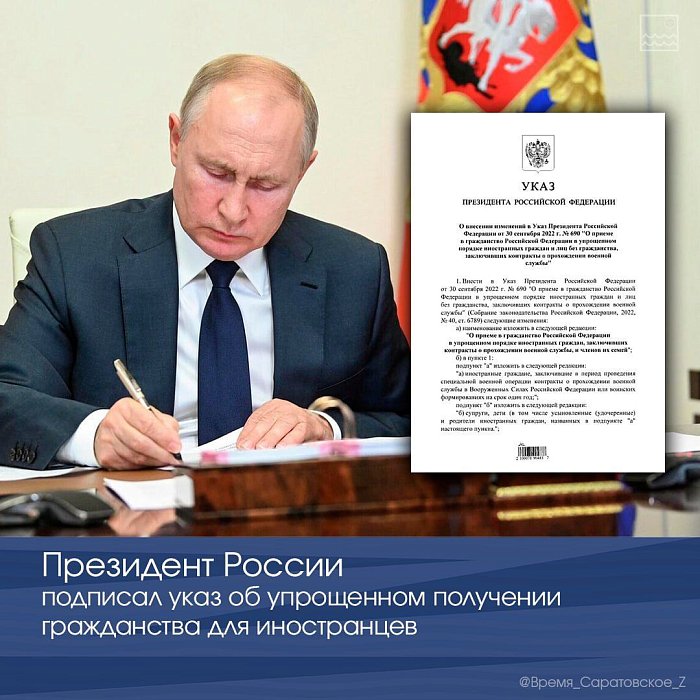 Президент России Владимир Путин подписал указ, который позволяет иностранным гражданам, заключившим в период проведения СВО контракты на прохождение военной службы в Вооруженных силах РФ, получить гражданство России в упрощенном порядке.Напомним, для военнослужащих, проходящих военную службу по контракту, предусмотрены льготы и меры поддержки (https://t.me/koronavirus_saratov/13332) на федеральном и региональном уровнях.