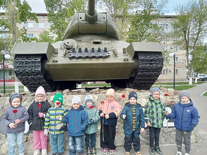 В преддверии праздника Великой Победы для воспитанников среднего возраста детского сада «Светлячок» с целью формирования военно-патриотического воспитания была организована экскурсия.Ребята побывали у легендарного танка Т-34 и в парке «Патриот», где узнали много нового и интересного о военной технике и возложили цветы.