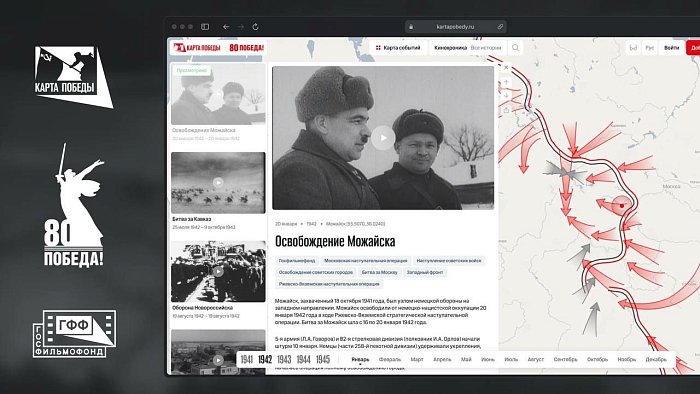 Госфильмофонд России при поддержке Министерства культуры Российской Федерации в партнерстве с Национальным центром исторической памяти при Президенте Российской Федерации в преддверии 80-летия Победы запускают мультимедийный проект «Карта Победы». Он содержит уникальные хроники Госфильмофонда, которые ранее практически не публиковались, научные статьи и экспертные мнения историков, — отметил генеральный директор Госфильмофонда России Денис Аксенов.
