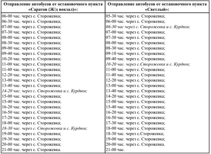 В целях обеспечения транспортной доступности населения изменяется расписание движения на межмуниципальных маршрутах регулярных перевозок пригородного сообщения № 491 «Саратов (Ж/д вокзал) - Светлый», № 491-А «Саратов (Ж/д вокзал) – Светлый (ч/з Сторожевку)» и № 491-Б «Саратов (Ж/д вокзал) – Светлый (ч/з с. Курдюм)».С 6 ноября 2025 года движение автобусов по межмуниципальным автобусным маршрутам регулярных перевозок пригородного сообщения № 491 «Саратов (Ж/д вокзал) - Светлый», № 491-А «Саратов (Ж/д вокзал) – Светлый (ч/з Сторожевку)» и № 491-Б «Саратов (Ж/д вокзал) – Светлый (ч/з с. Курдюм» будет осуществляться ежедневно согласно следующему расписанию.