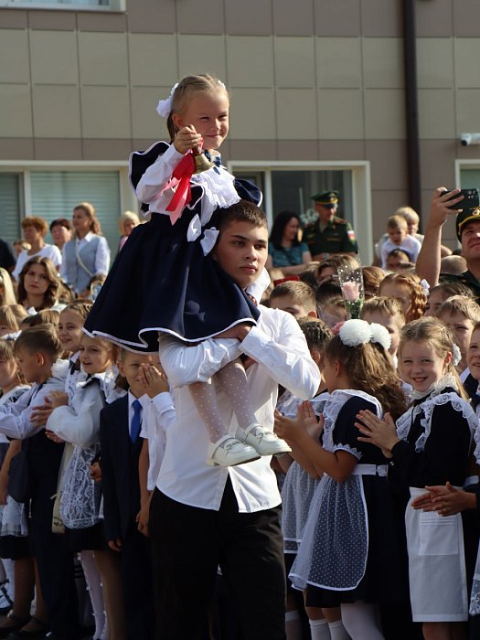 И вот уже радостно звенит школьный звонок, оповещая о начале учебного года. Его дали ученица 1-го класса Виктория Сорокина и ученик 11-го класса Арсений Харыбин.