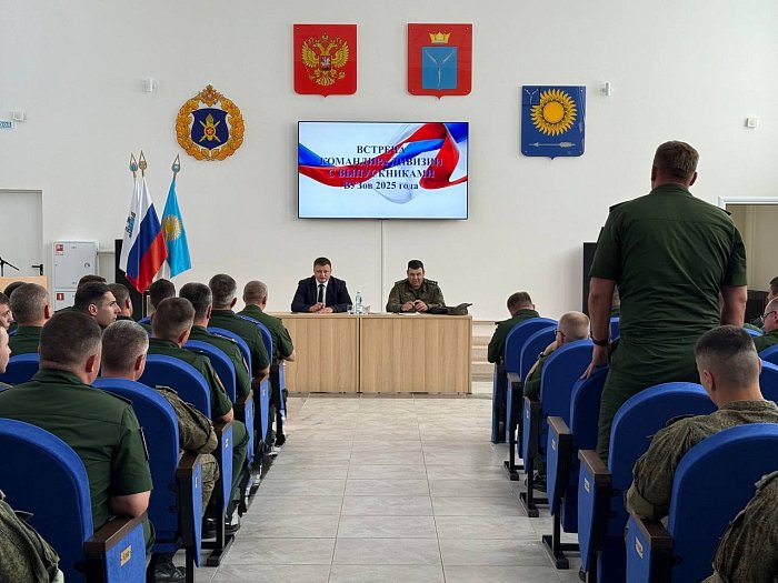 В Георгиевском зале Дома культуры состоялась встреча командира дивизии Алексея Воинова с выпускниками военных вузов 2025 года. Познакомился с молодыми офицерами – будущим нашей армии и глава городского округа Сергей Баталов.