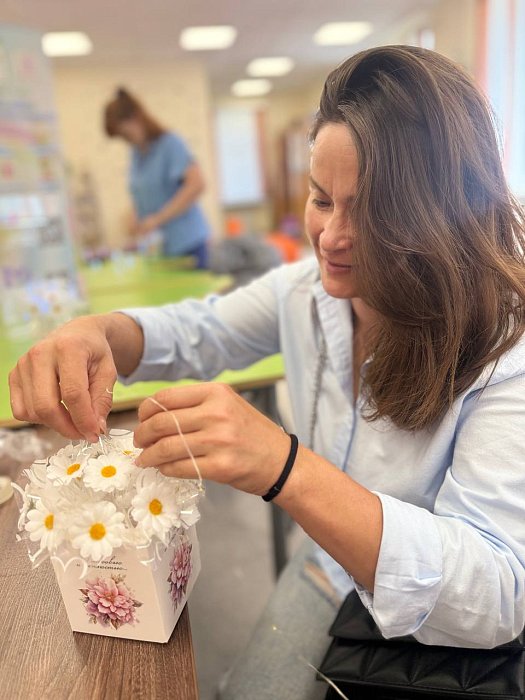 Подшефные проекта «Мы вместе детям» под руководством директора филиала центра "Молодежь Плюс" в ЗАТО Светлый Елены Егоровой, директора АНО «Мы вместе детям» Алены Шебаловой, библиотекаря Дом культуры Анны Чеботаевой, начальника Отдела ЗАГС по ЗАТО Светлый Анны Михайлюковой, погрузившись в атмосферу творчества, изготовили декорированные подсветкой букеты из ромашек.