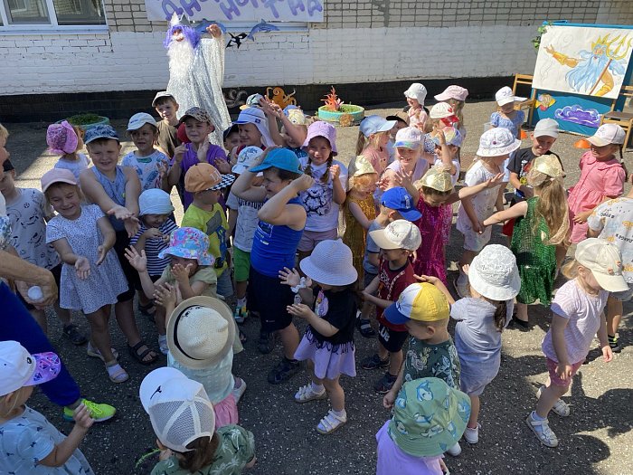 В солнечный летний день в детском саду «Светлячок» состоялся веселый и незабываемый праздник — «День Нептуна». Это событие стало настоящим торжеством для всех ребят, ведь они смогли не только весело провести время, но и окунуться в атмосферу морских приключений.Праздник начался с торжественного выхода Нептуна — повелителя морей и океанов. Дети с восторгом встретили своего любимого персонажа, ведь Нептун всегда приносит с собой веселье и радость множество увлекательных игр и эстафет. Царь морей пришел на праздник не один, а в окружении своих верных помощников — золотых рыбок, которые, словно по волшебству исполнили с ним зажигательный танец.