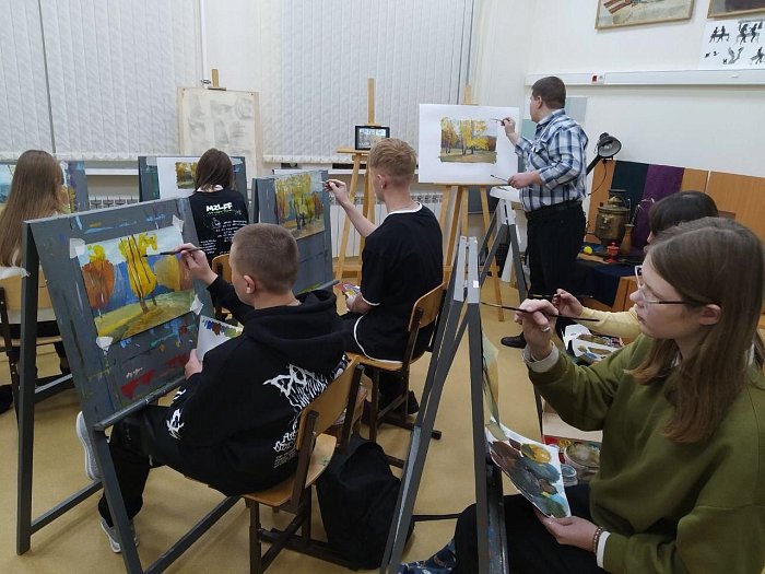 В Детской школе искусств прошёл мастер-класс на тему: "Пейзаж. Ключевые этапы живописи". Кстати, мастер-класс проводился в рамках программы "Пушкинская карта". Среди присутствующих были и выпускники, и обучающиеся старших классов, и гости школы.