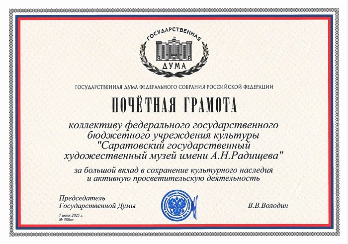 ️Вячеслав Володин наградил Почетной грамотой Государственной Думы коллектив Саратовского государственного художественного музея имени А.Н. Радищева.Отмечен большой вклад сотрудников музея в сохранение культурного наследия и активную просветительскую деятельность.