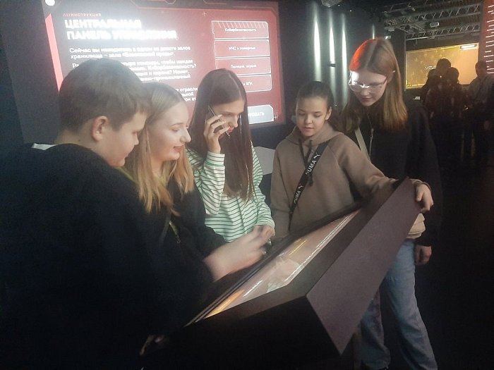 Разбившись на команды, школьники выполняли интересные задания на тач-панелях, за выполнения которых получали бинаты.