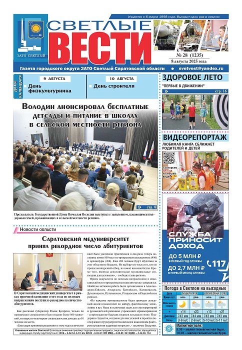 В ближайшем номере газеты «Светлые вести» вас ожидает:- Володин анонсировал бесплатные детсады и питание в школах в сельской местности региона;