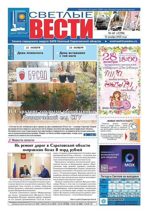 В ближайшем номере газеты «Светлые вести» вас ожидает:- В Саратове открыли обновлённый Ботанический сад СГУ;