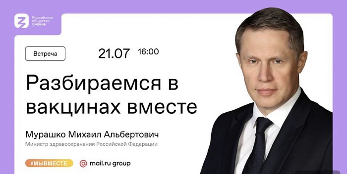 Прямой эфир с министром проведет российское общество «Знание» при поддержке акции #МыВместе. Задать вопрос можно на сайте: vk.cc/c48eSU Это первая онлайн-встреча проекта «Разберемся в вакцинах вместе». Он призван помочь принять решение по прививке, развеять мифы, дать четкую инструкцию по порядку вакцинирования в регионах.