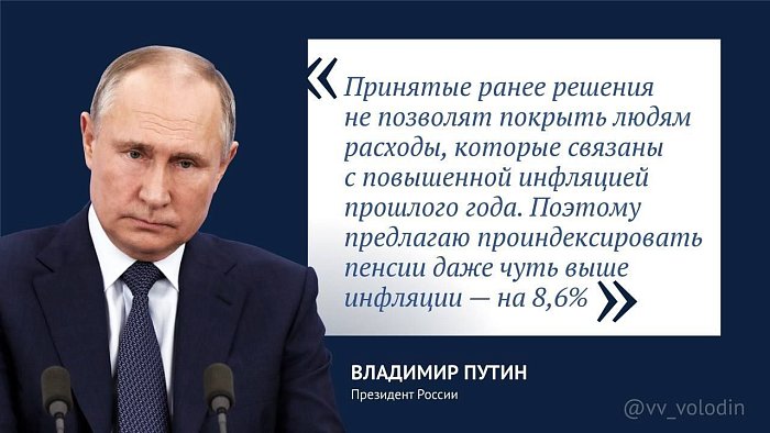 Сегодня Государственная Дума рассмотрит вопрос об индексации пенсий выше уровня инфляции — на 8,6 %. Об этом сообщил Председатель Государственной Думы Вячеслав Володин в своем Telegram-канале.Он подчеркнул, что соответствующее поручение было дано Президентом Владимиром Путиным. Правительство подготовило поправки, которые позволяют нам принять это решение в кратчайшие сроки.