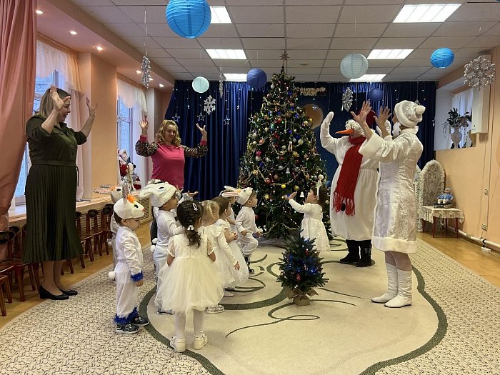 Малыши из группы раннего возраста собрались вместе, чтобы встретить праздник в компании Снегурочки и озорного Снеговичка, окруженные волшебством новогодней елочки.