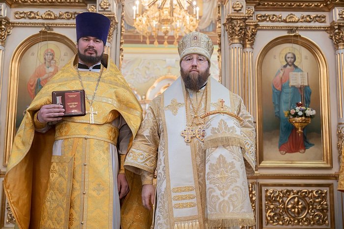 За богослужением состоялось вручение Архиерейских наград. За усердные труды во благо Церкви Христовой иерей Алексий Новичков был удостоен медали Саратовской епархии в честь священномученика Германа, епископа Вольского, II степени.