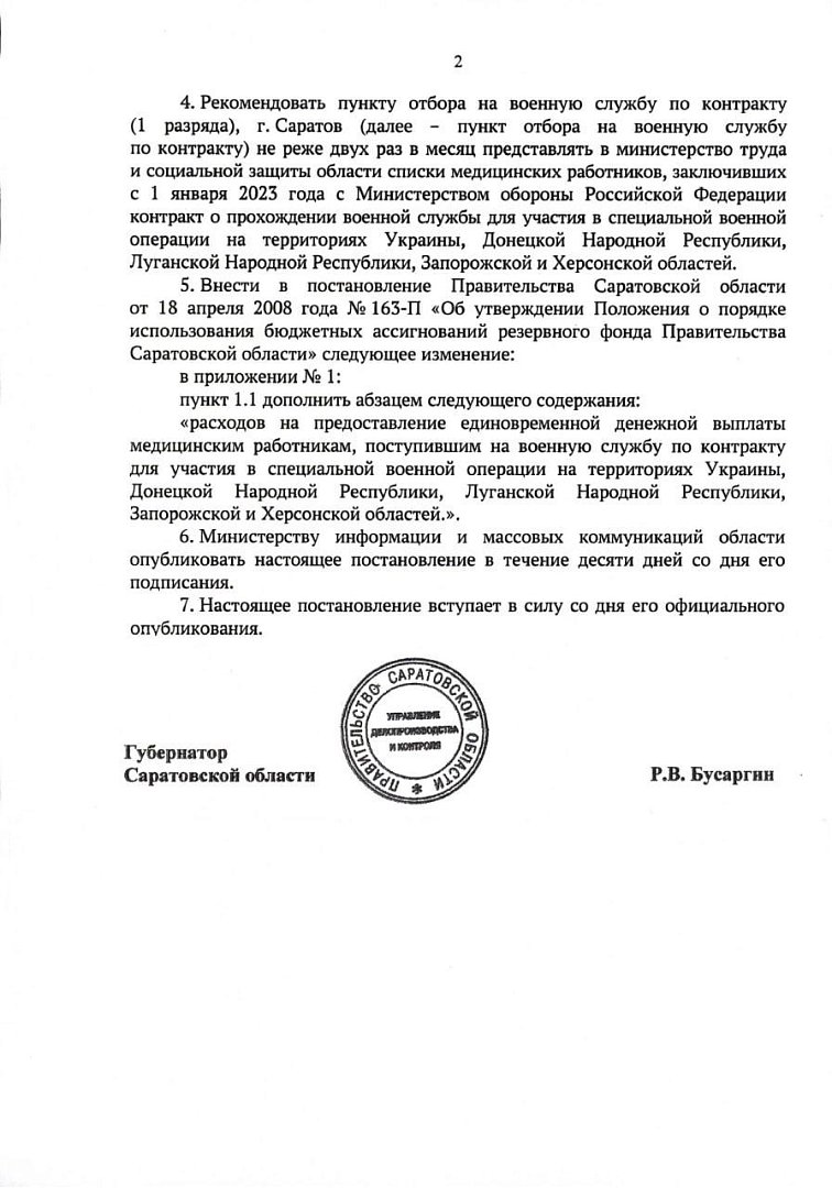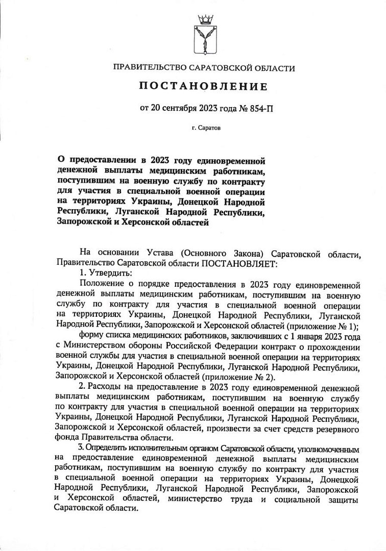 Губернатор Роман Бусаргин подписал Постановление Правительства области о предоставлении медицинским работникам, поступившим на военную службу по контракту для участия в специальной военной операции, единовременной денежной выплаты. Размер выплаты составит 50 тысяч рублей. Она предоставляется медицинским работникам, проживающим на территории региона и заключившим не ранее 1 января 2023 года с Министерством обороны РФ контракт о прохождении военной службы для участия в специальной военной операции на территориях Украины, ДНР, ЛНР, Запорожской и Херсонской областей.