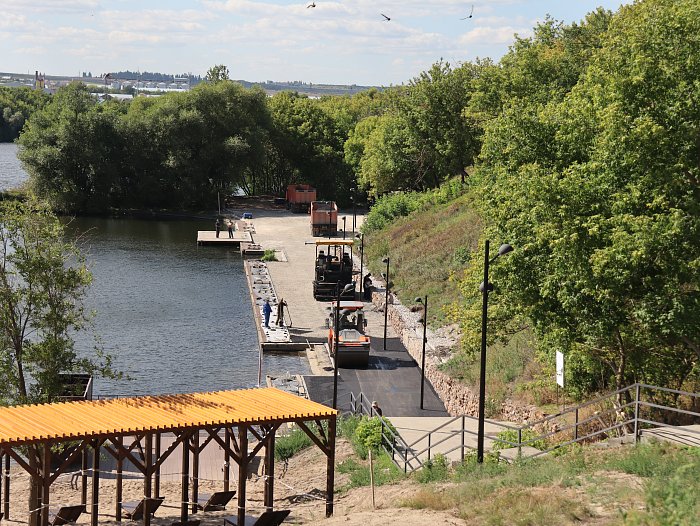 Сегодня территория променада «одевается» в новый асфальт. Это завершающие работы на данном объекте. Здесь уже появились просторные теневые навесы с размещенными под ними лежаками, помост с душем, питьевым фонтанчиком и кабинами для переодевания. На пляж завезен речной песок. Водоём от набережной теперь отделяет широкая террасная доска. И, конечно, комфортным и длительным прогулкам будут способствовать софиты обустроенной ранее новой фонарной линии.