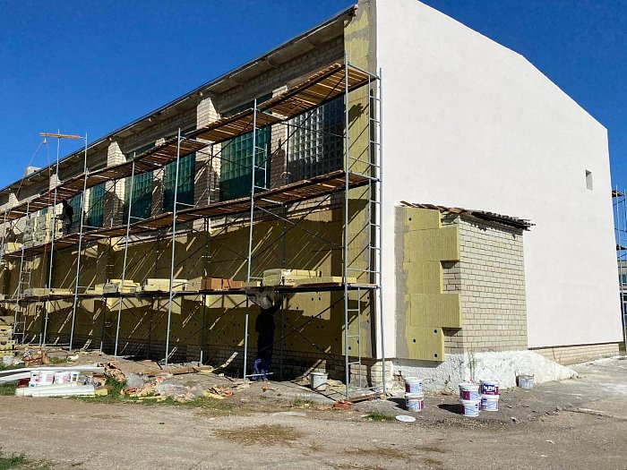 В настоящее время здесь активно продолжаются работы по утеплению стен спортзала.