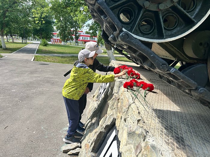 В преддверии Дня памяти и скорби воспитанники пришкольного лагеря возложили цветы к памятнику «Танк» в память о тех, кто отдал свои жизни за свободу и будущее нашей Родины.Этот трогательный жест стал символом благодарности и уважения подрастающего поколения к подвигам предков, защищавших Родину в годы Великой Отечественной войны.