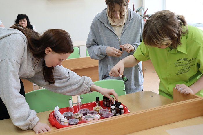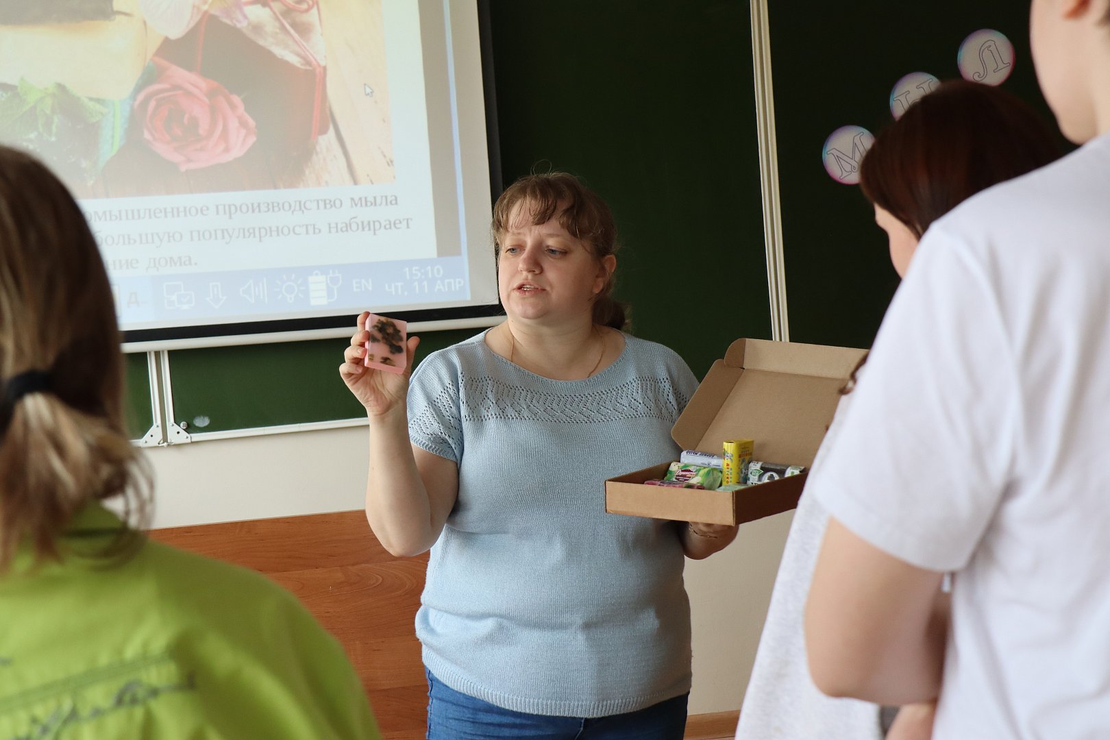 Старшеклассники под руководством учителя химии Евгении Ященко погрузились в увлекательное занятие: они осваивали азы создания полностью натуральных авторских брусочков мыла.