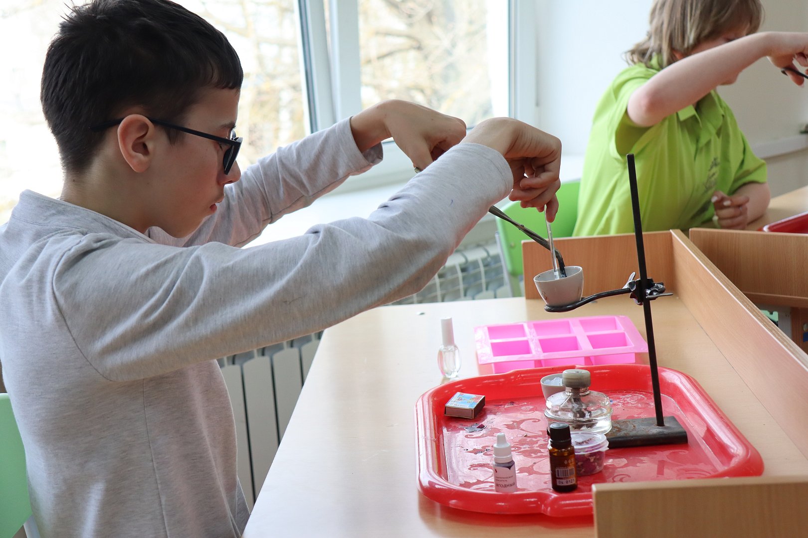 Обычный школьный класс в это время будто превратился в место встреч тайного общества алхимиков, обладающих секретными знаниями. Спиртовки, штативы, щипцы, колбочки, множество флакончиков и баночек – атмосфера в классе царила небывалая! В воздухе витали ароматы масел и трав, а ребята перевоплотились в истинных мыловаров.