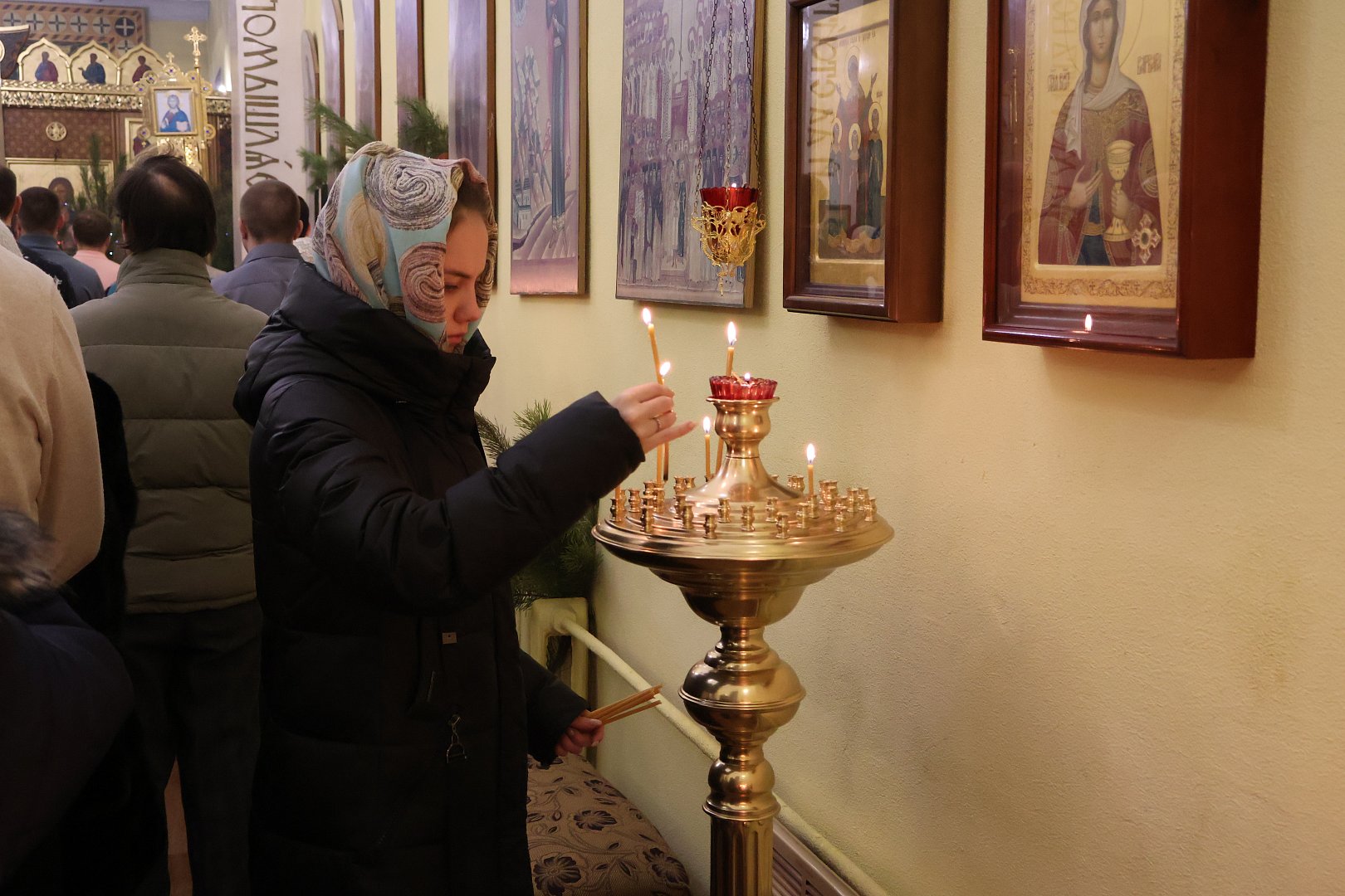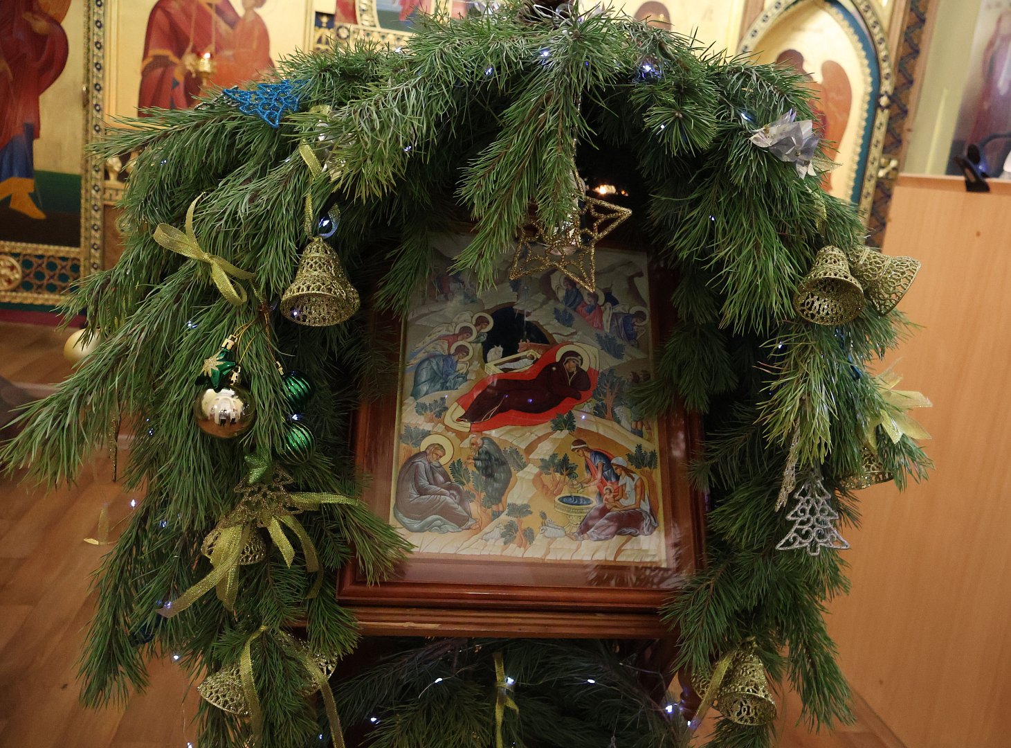 Храм был полон прихожан, среди которых были не только взрослые, но и дети. Людей было немало, но места хватало всем. Верующие приходили на службу заранее. Многие зажигали свечи, молились и прикладывались к иконам. Иконы, в свою очередь, были празднично украшены, как и весь храм, - еловыми ветвями и гирляндами. Это добавило празднику особую атмосферу уюта и волшебства.