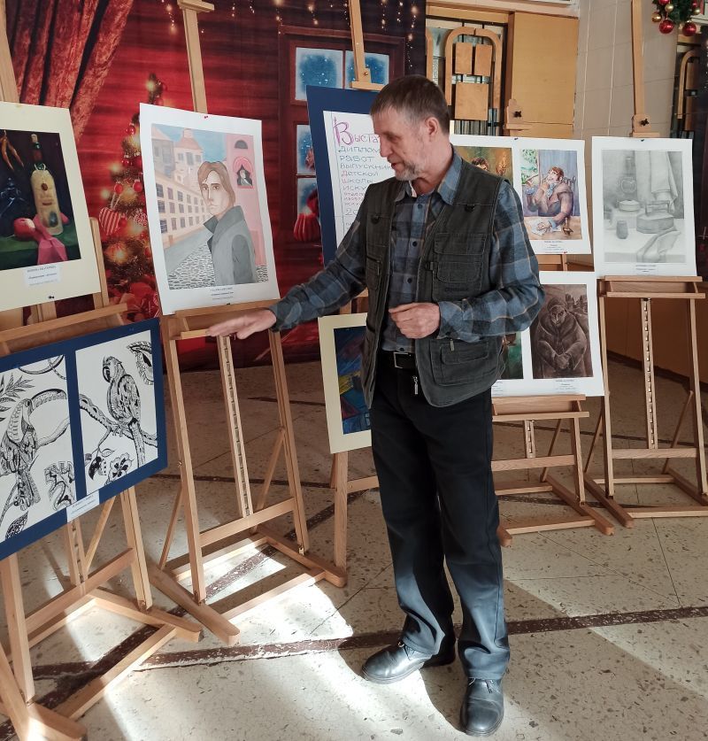 Увлекательную экскурсию по экспозиции провёл преподаватель ДШИ С.Н. Панфилов. Он подробно рассказал нам о дипломных работах выпускников, что позволило глубже прочувствовать каждую картину. По его словам, большинство дипломных работ сильные и качественные, выполненные на высоком уровне. Нет простых работ, в каждой свои особенности. Выставка - показатель успешности учеников, результат усилий, затраченных в процессе обучения в течение многих лет.