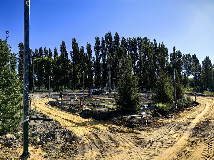 Что касается строительных работ, здесь смонтировали современное наружное освещение и систему автополива, также запланирована установка камер видеонаблюдения. Прогулочные зоны постепенно оформляются бордюрным камнем, активно идёт устройство бетонных ступеней и основания под теневые навесы – перголы.