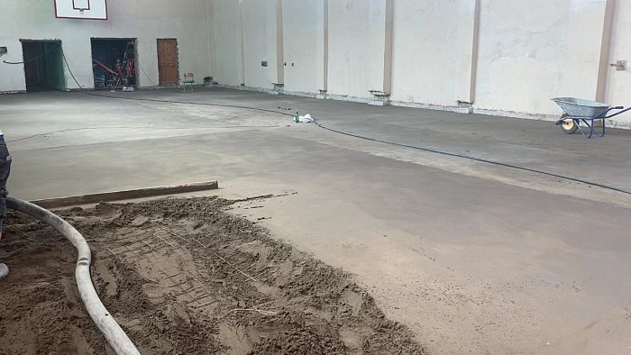 Первый этап ремонта уже миновал: в спортзале сняты пол и облицовка стен, демонтирован потолок. В настоящее время идёт заливка и укрепление пола, чтобы проводить дальнейшие штукатурные и малярные работы.