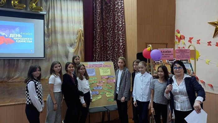 Для учеников 7-х классов подготовлена и проведена литературно-музыкальная композиция «России славные сыны». Под звуки музыки дети читали стихи, ведущие рассказывали об истории России, которая много раз подвергалась испытанию на прочность, не раз переживала времена, когда нарушалось единство, когда в стране царили распад, хаос, вражда, анархия, катастрофа.