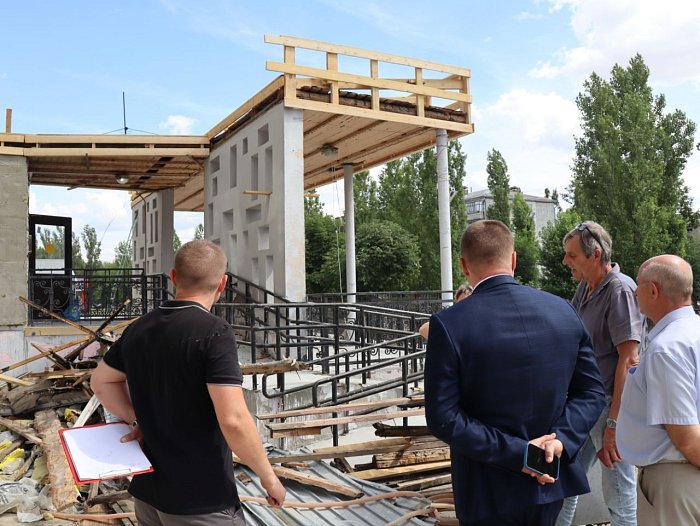 Обговорили возможность увеличения размера козырька над центральным входом, чтобы он закрывал от дождя спуск для инвалидов. Обсудили проблемные вопросы в рамках договора. Представителям подрядной организации Сергей Баталов указал на строгое соблюдение сроков исполнения работ.