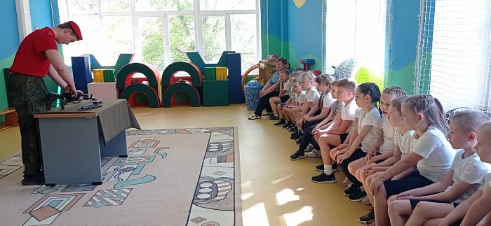 Дети двух подготовительных к школе групп посмотрели военную и физическую подготовку юнармейцев, которые продемонстрировали сборку и разборку автоматов на время, а также показали приёмы боевых искусств.