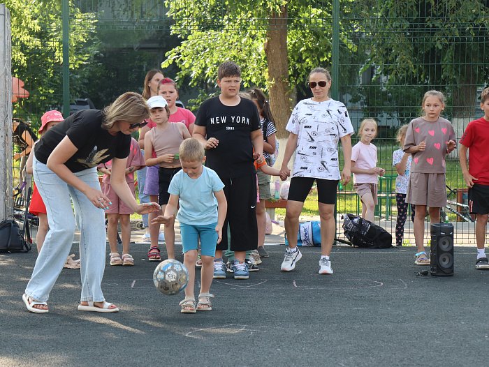 Свежий воздух, яркое солнце, игры и эстафеты под заводную музыку - именно так развлекалась детвора на площадке мини-футбольного поля. Желающих поиграть было много, и всем им были очень рады. Разбившись на две команды, ребята состязались в скорости и ловкости, активно поддерживая друг друга. Победила, конечно же, дружба, и все ушли с развлечения со сладкими подарками.